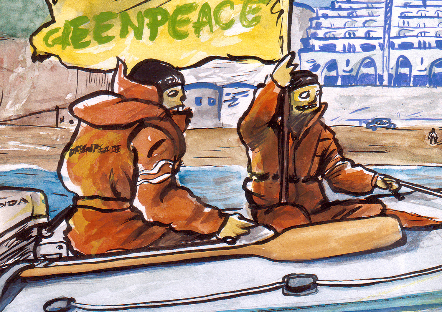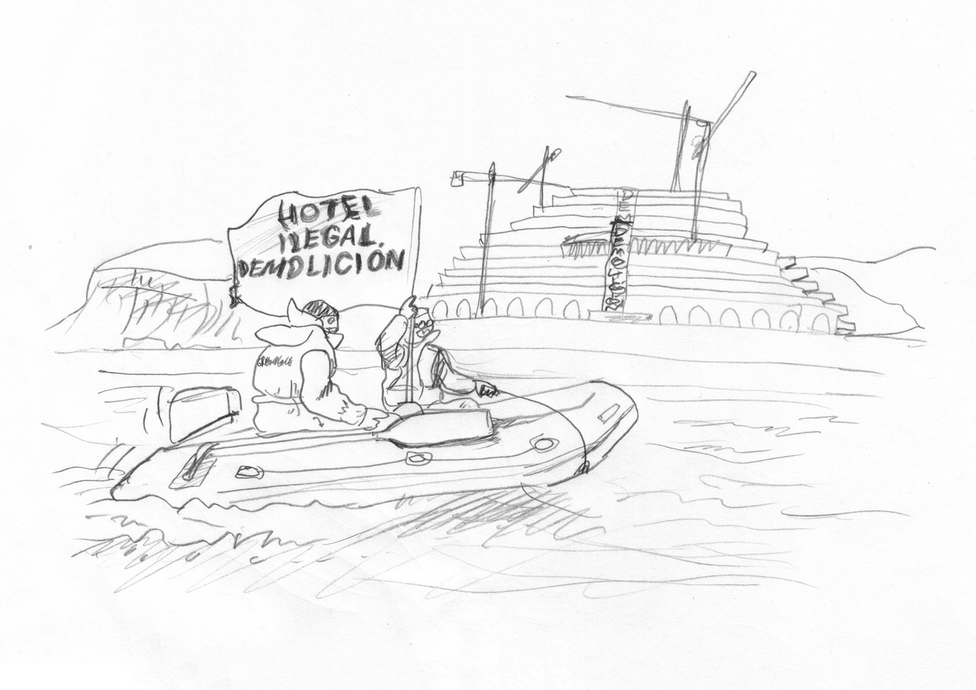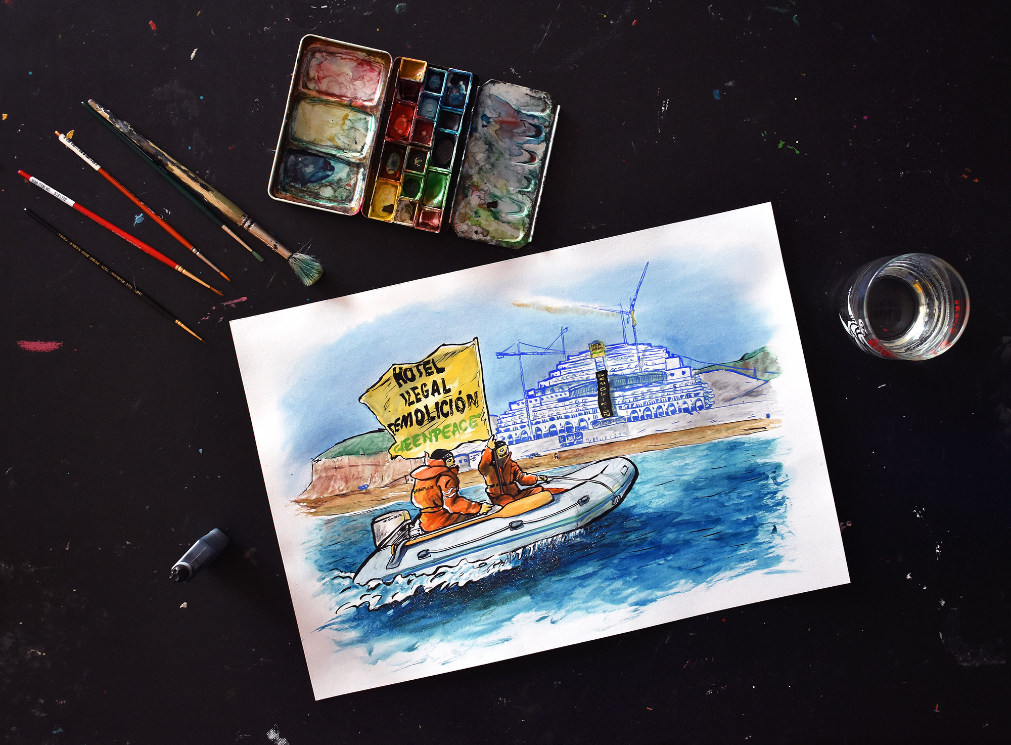 Para el dibujo tomamos de referencia la escena de dos activistas de Greenpeace en lancha delante del hotel. Después escaneamos la acuarela y le añadimos en el ordenador el cuadrado de la selección. Todos los chanchullos y crímenes ambientales a la basura.