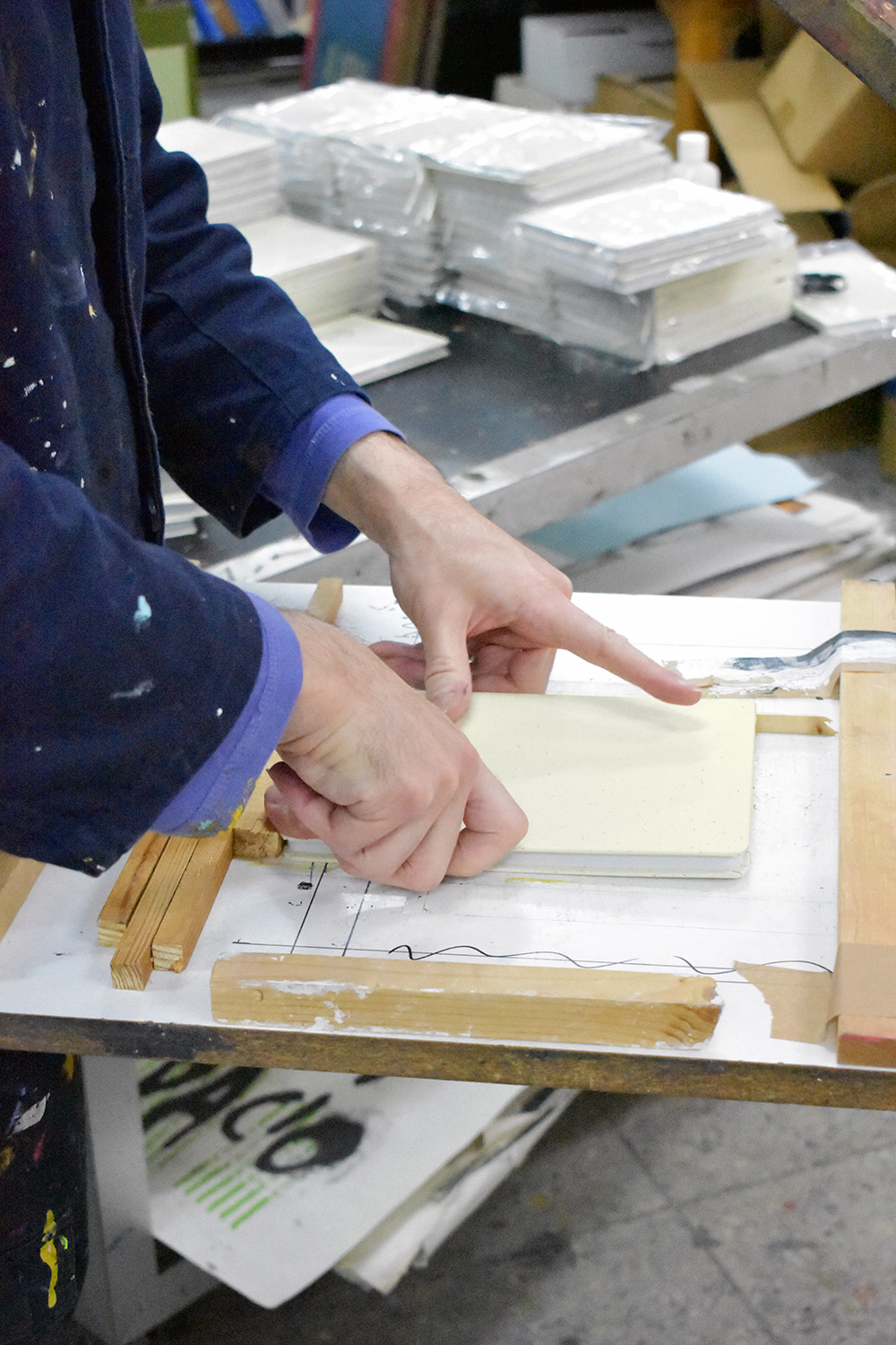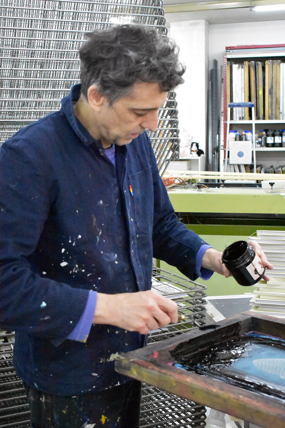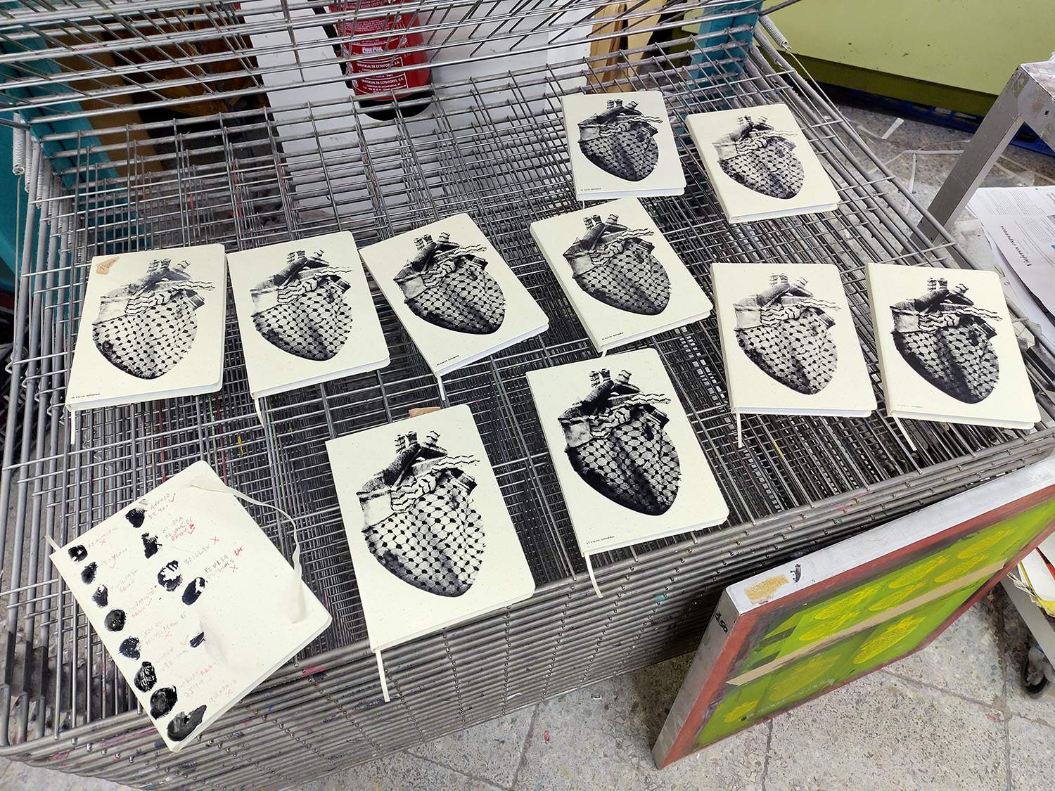 Para reproducir este corazón hicimos mogollón de pruebas. El lenguaje de la serigrafía se basa en tintas planas. Por eso las imágenes fotográficas es necesario tramarlas. Truquillos. Pero hay que saber qué lineatura y qué angulo. Y todo lleva su curro. Además la portada del bloc está plastificada y hay que averiguar qué tinta es la que mejor va a agarrar. Ese día llegó tarde la hora de la merienda en el taller.