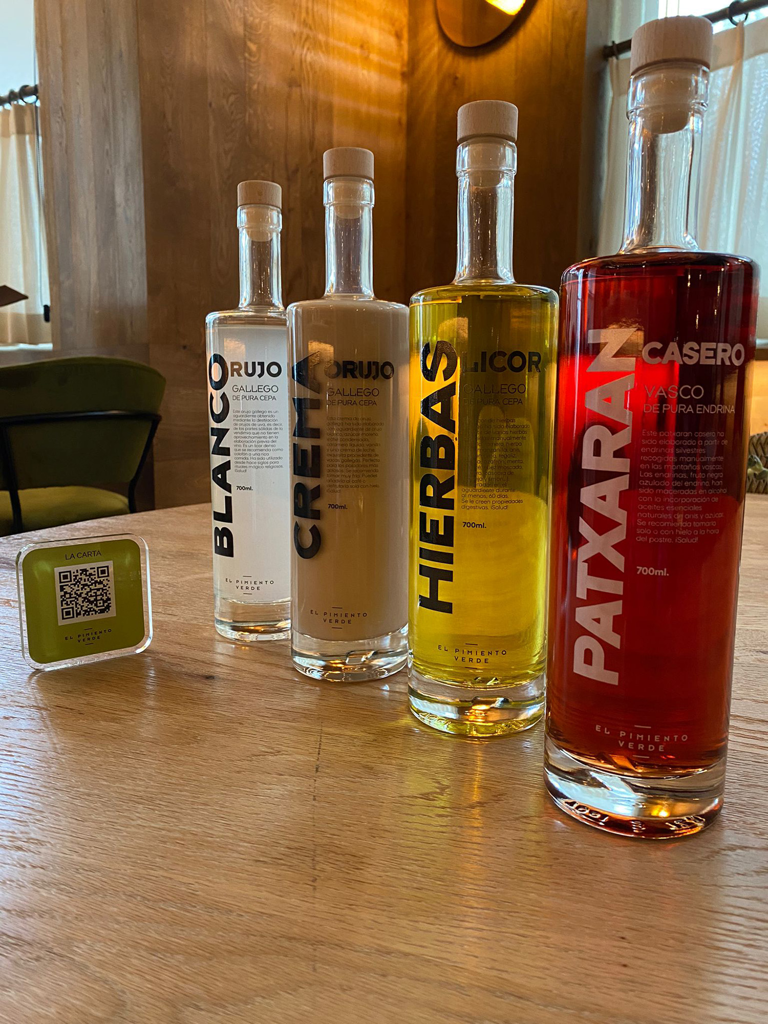 Botellas para dos orujos, un licor y un patxaran. ¡No patxaran!