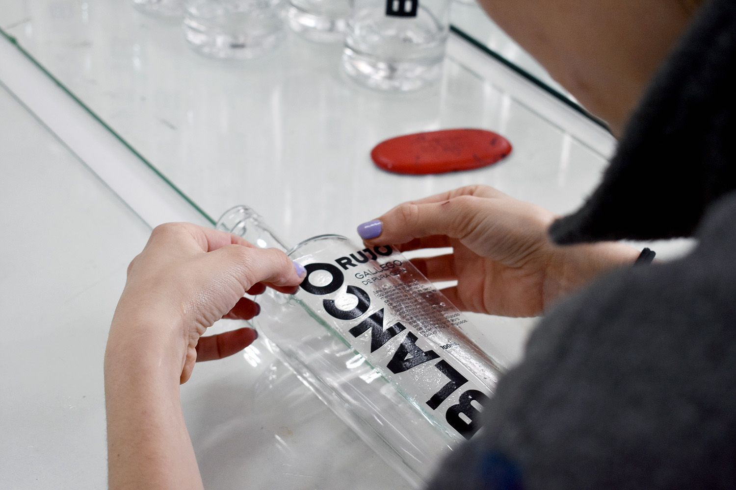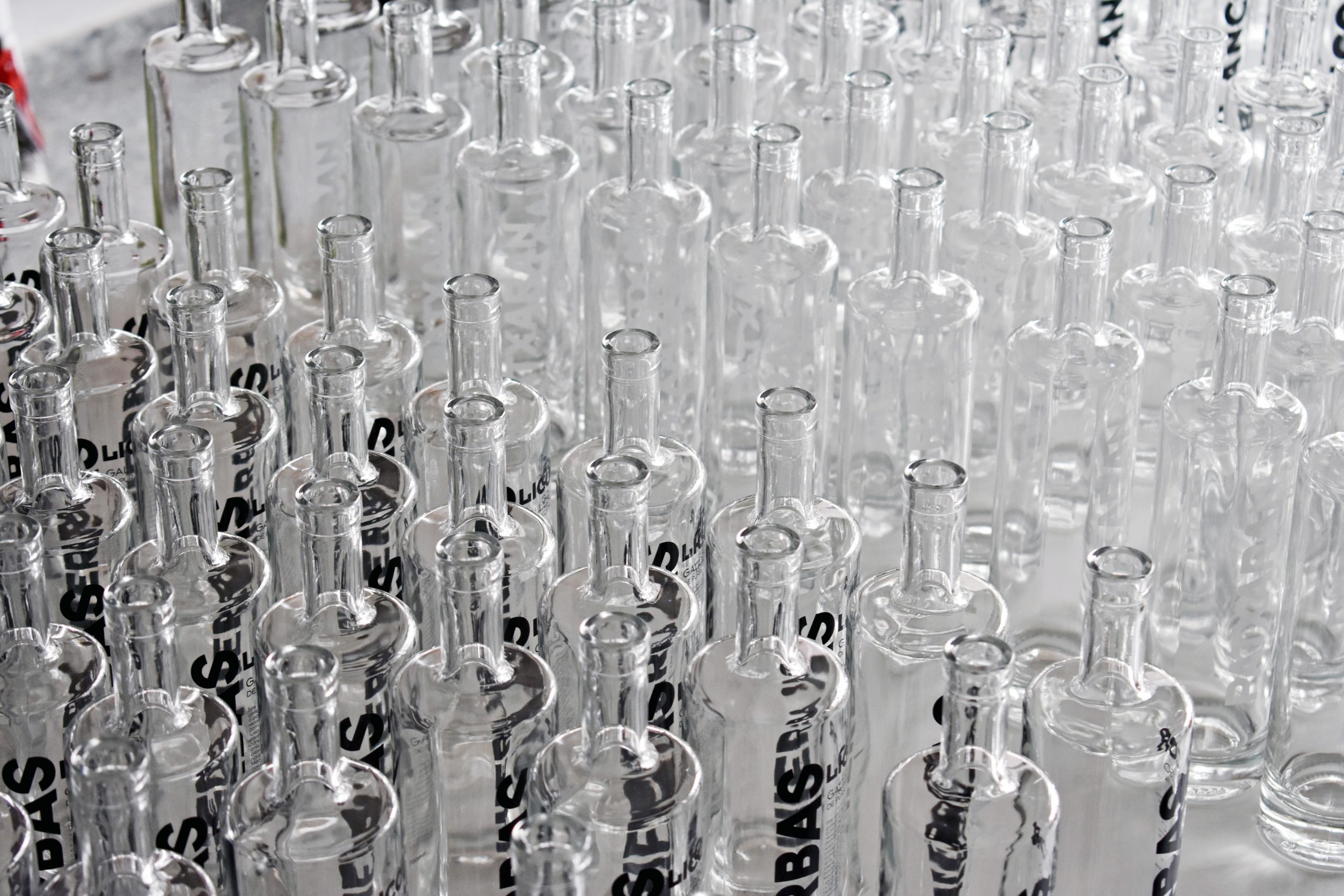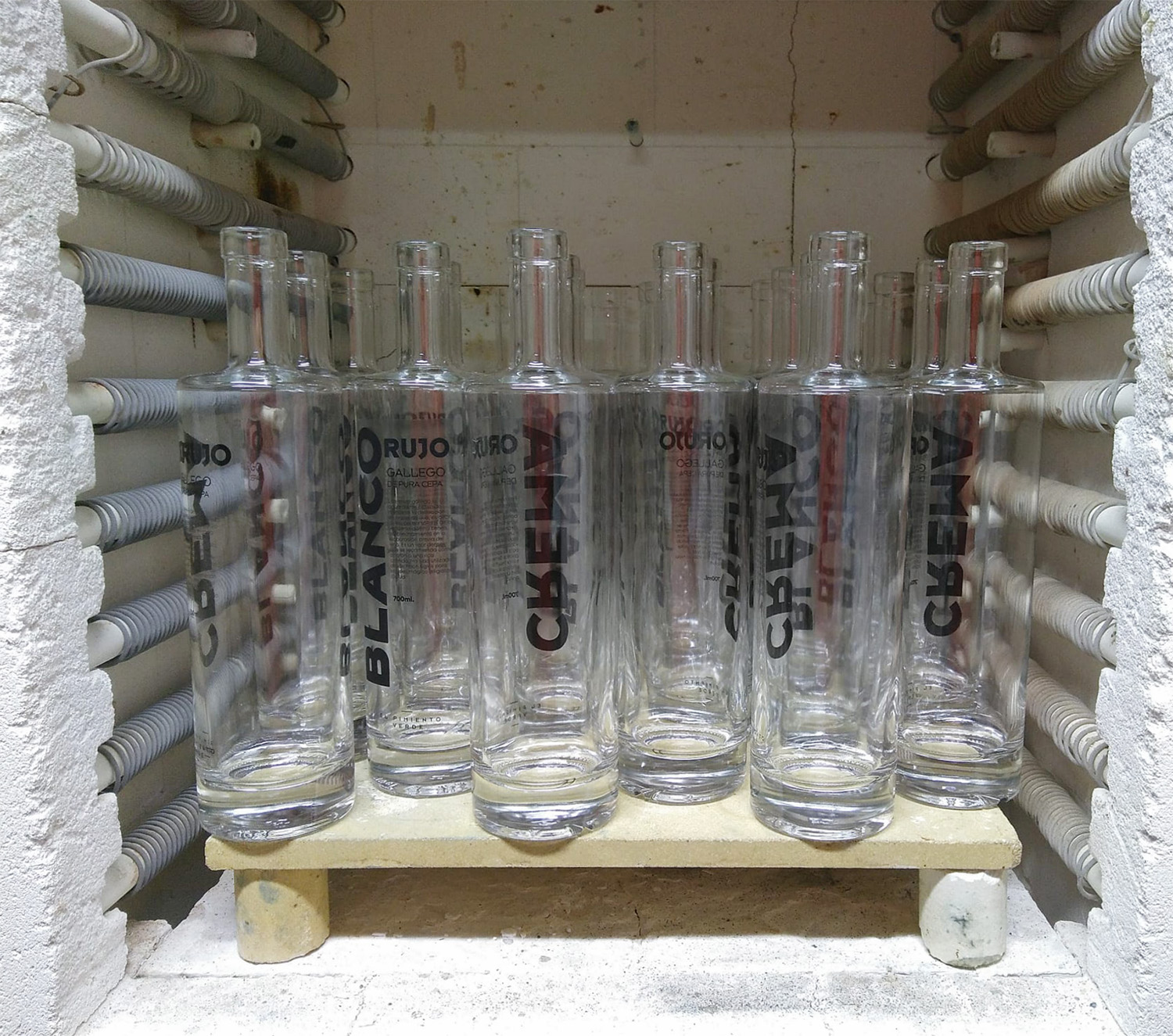 El proceso ha sido el habitual en estos casos del vidrio. Hemos serigrafiado las hojas de calca con pigmentos vitrificables de vidrio, que son como los de cerámica pero se vitrifican a otra temperatura, así que no confundirse con los botes, por favor; hemos posicionado las calcas cuidadosamente, revisando que estén completamente perpendiculares y a la distancia adecuada; hemos horneado las botellas sin los corchos a 600º Celsius, no confundir con los grados Fahrenheit porque tendríamos problemas. Después de esto las bebidas espirituosas pueden acceder al interior para el posterior deleite de todos los comensales, menos yo, que no bebo alcohol.