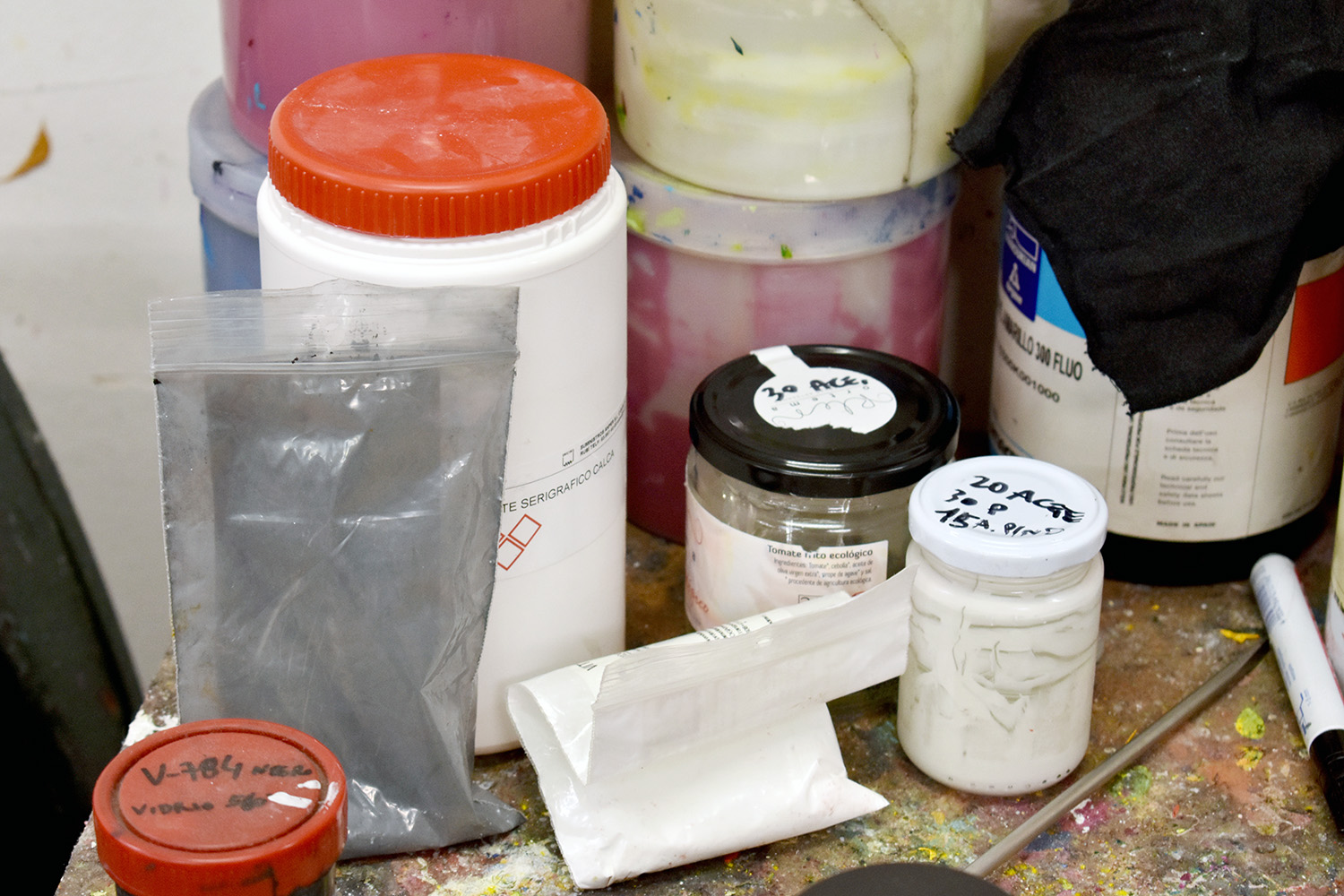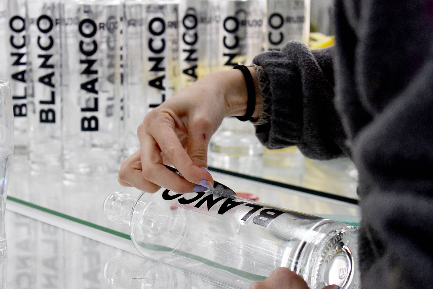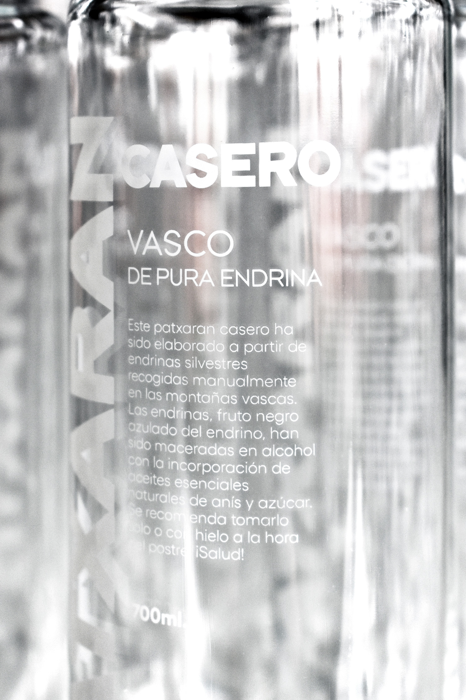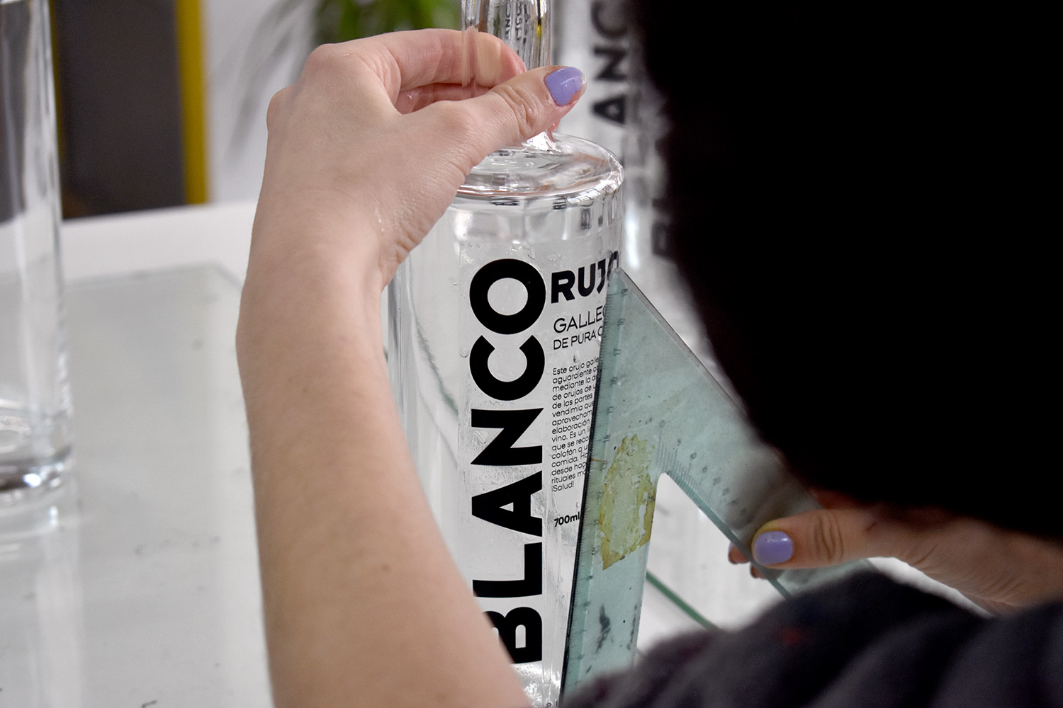 El proceso ha sido el habitual en estos casos del vidrio. Hemos serigrafiado las hojas de calca con pigmentos vitrificables de vidrio, que son como los de cerámica pero se vitrifican a otra temperatura, así que no confundirse con los botes, por favor; hemos posicionado las calcas cuidadosamente, revisando que estén completamente perpendiculares y a la distancia adecuada; hemos horneado las botellas sin los corchos a 600º Celsius, no confundir con los grados Fahrenheit porque tendríamos problemas. Después de esto las bebidas espirituosas pueden acceder al interior para el posterior deleite de todos los comensales, menos yo, que no bebo alcohol.