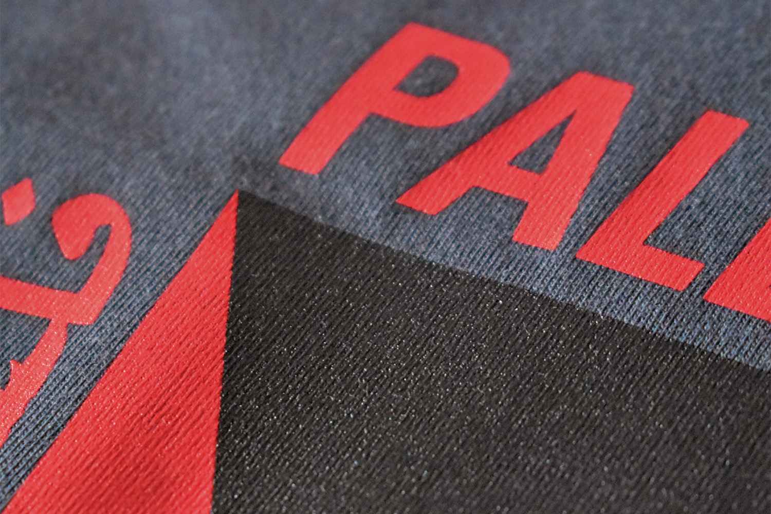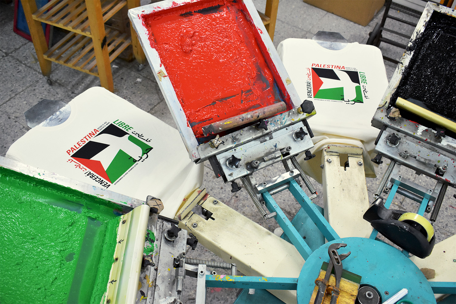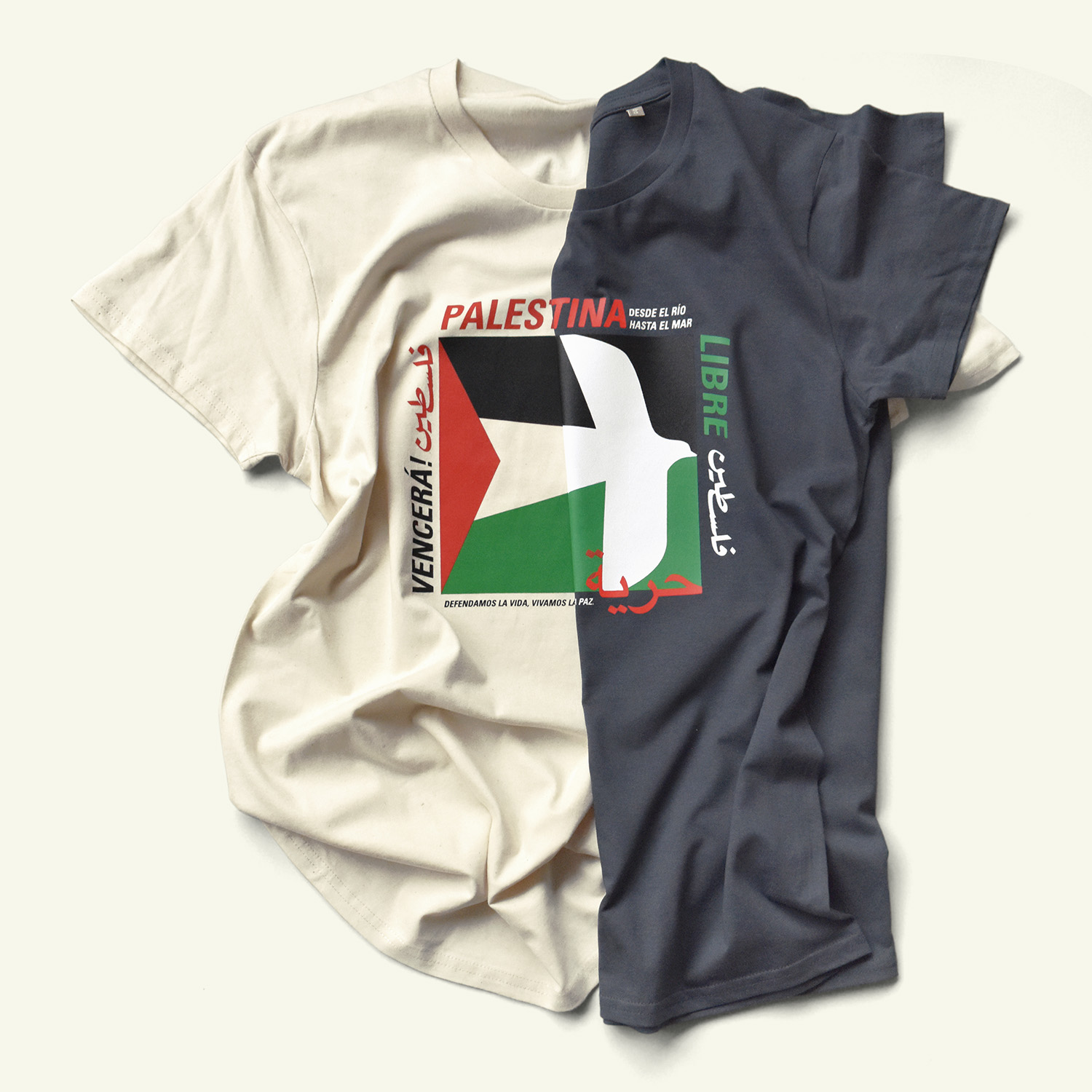 En las camisetas naturales hemos estampado tres tintas, la paloma no va estampada, mientras que en las grises han sido cuatro, con la paloma y algún texto en blanco.