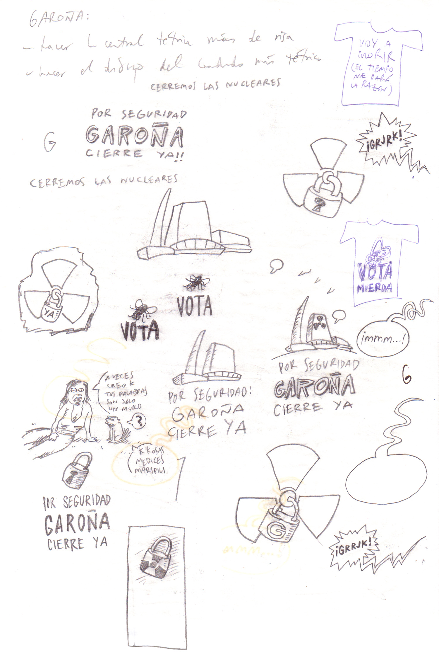 También veréis una página del cuaderno donde aparecen algunos de los bocetos a lápiz, seguido de los que presentamos. Pero estaba claro cuál era el más bonito. Después de barajar distintas posibilidades, dibujamos a la central como una vieja cascarrabias inaguantable deseando que el Señor se la llevara de una vez de este mundo.