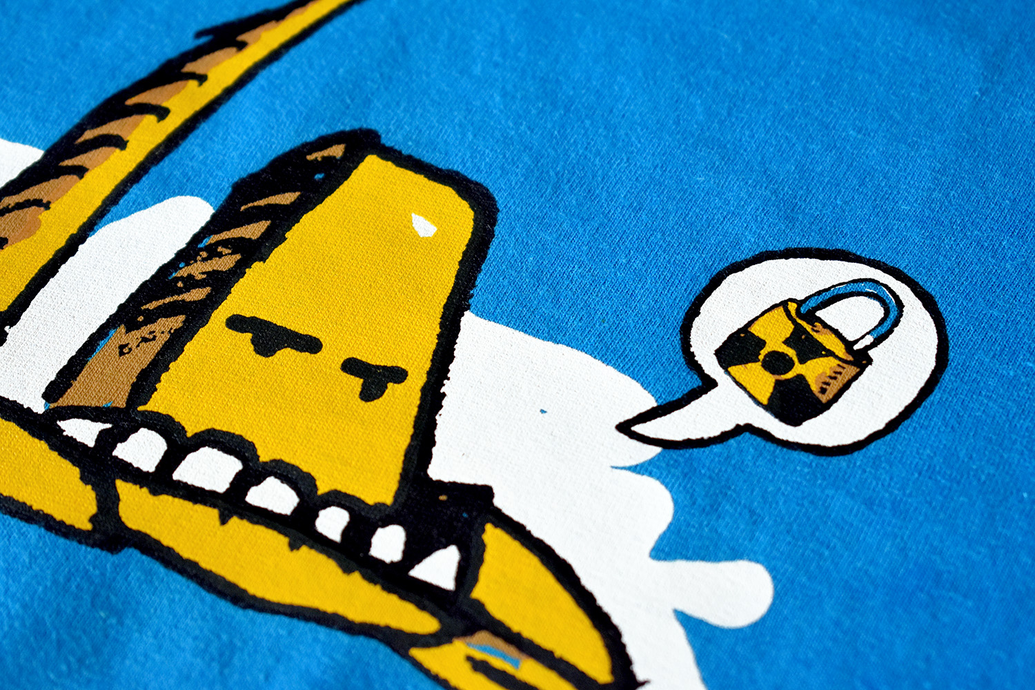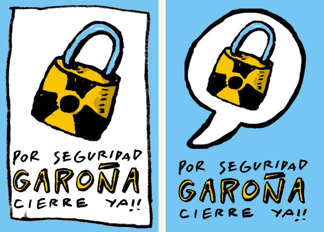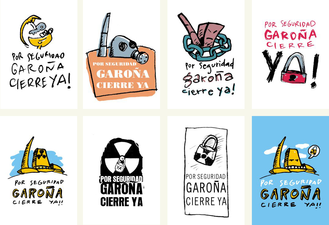 Y serigrafía de camisetas para la marcha por el cierre de la central nuclear de Garoña. Al lado podéis ver los dibujos finales para los dos lados de la camiseta y el resultado final serigrafiado. Debajo, los dos diseños que preparamos para las pegatinas.