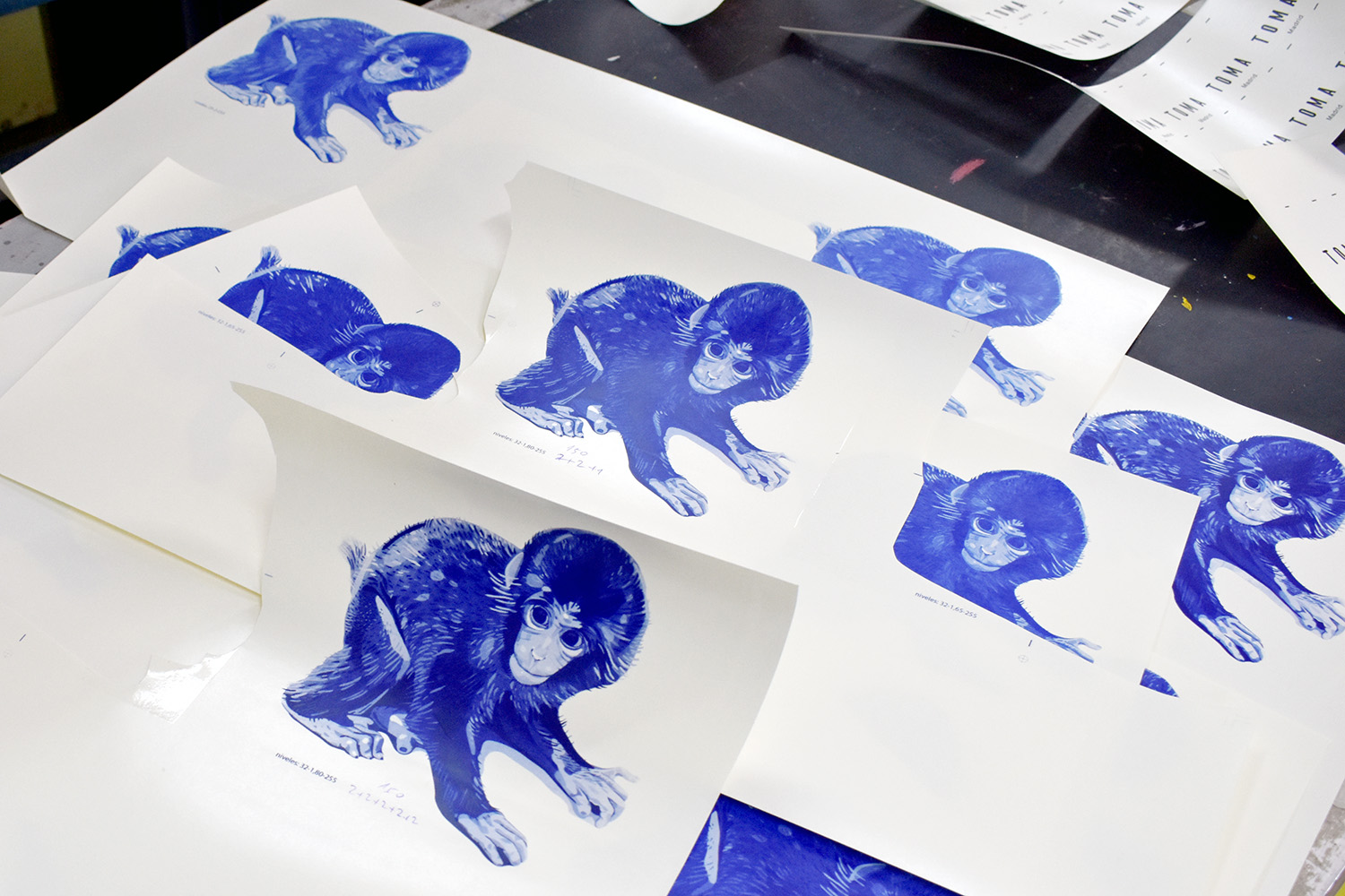 Los dibujos de Ruth son muy serigráficos: tintas planas. Sin embargo, nunca los había reproducido en serigrafía: muchísimos colores. Así es difícil economizar en pantallas. Pero siempre hay una salida. Ha resuelto este monito en distintas gradaciones de un sólo color. Con una sola pantalla está todo arreglado. Los distintos tonos los hemos convertido en tramas.