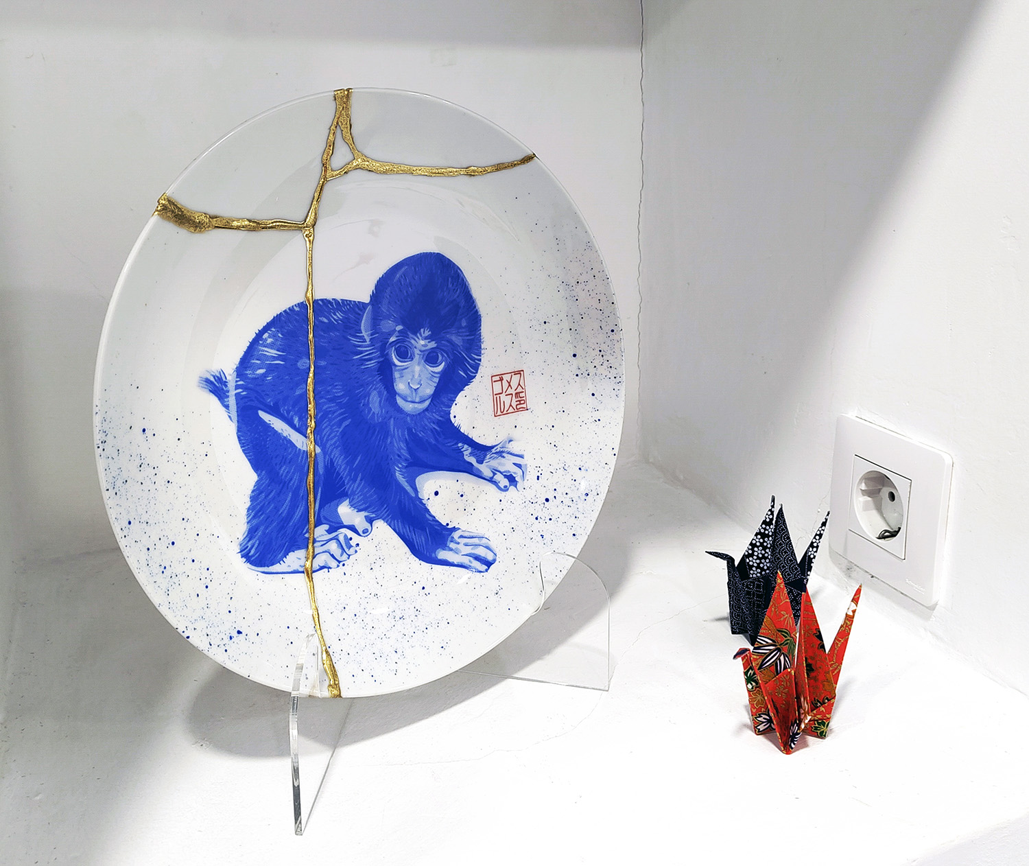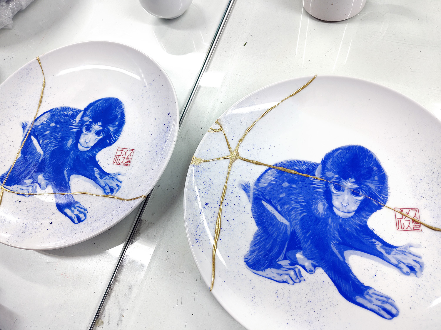 Hemos estampado con pigmentos cerámicos vitrificables y, tras el primer horneado, Ruth los ha intervenido con salpicaduras y rompiéndolos a martillazos, a varios martillazos, para después pegarlos con la técnica del Kintsugi, esas uniones doradas que veis. Forman parte de su último proyecto ‘Procesos entre el Aware y el Ikigai‘, fruto de su reciente viaje a Japón, que está muy lejos.