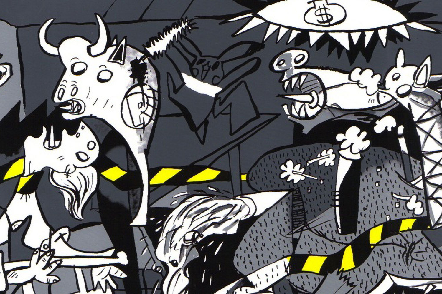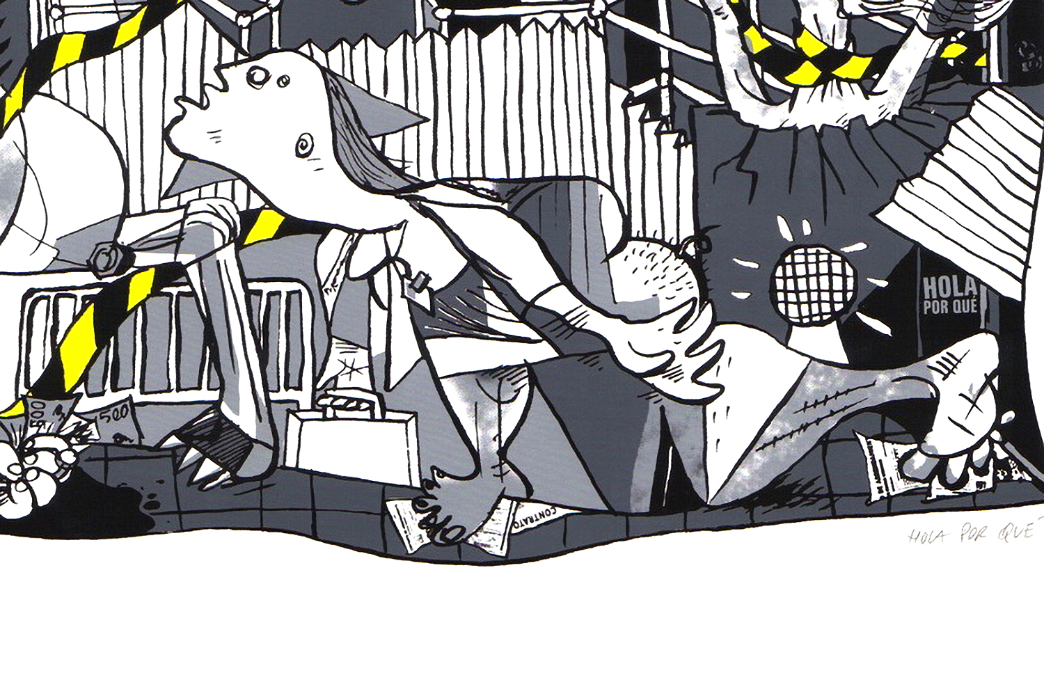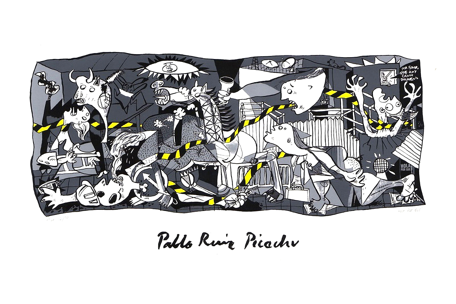 Hemos realizado una versión especial de este famoso cuadro que pintó uno que ahora está muerto, y lo hemos estampado en bolsas y camisetas, además de unas chapas que hemos hecho con partes del dibujo. Aunque sigue habiendo guerras, creemos que la civilización también tiene vencedores y vencidos, y eso es lo que hemos querido reflejar aquí. Hay trabajadores explotados, constructores muertos amasando billetes, gente que no quiere ver nada alumbrando con linternas que dan oscuridad, inmobiliarios pisando contratos, … en fin, todo un espectáculo. Y también hay un Picachu sustituyendo a la paloma de la paz del cuadro original.