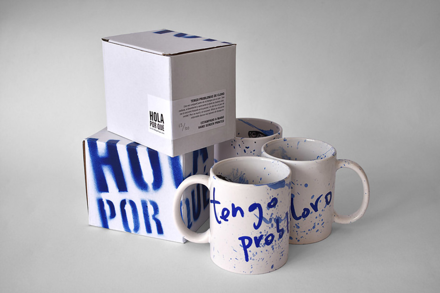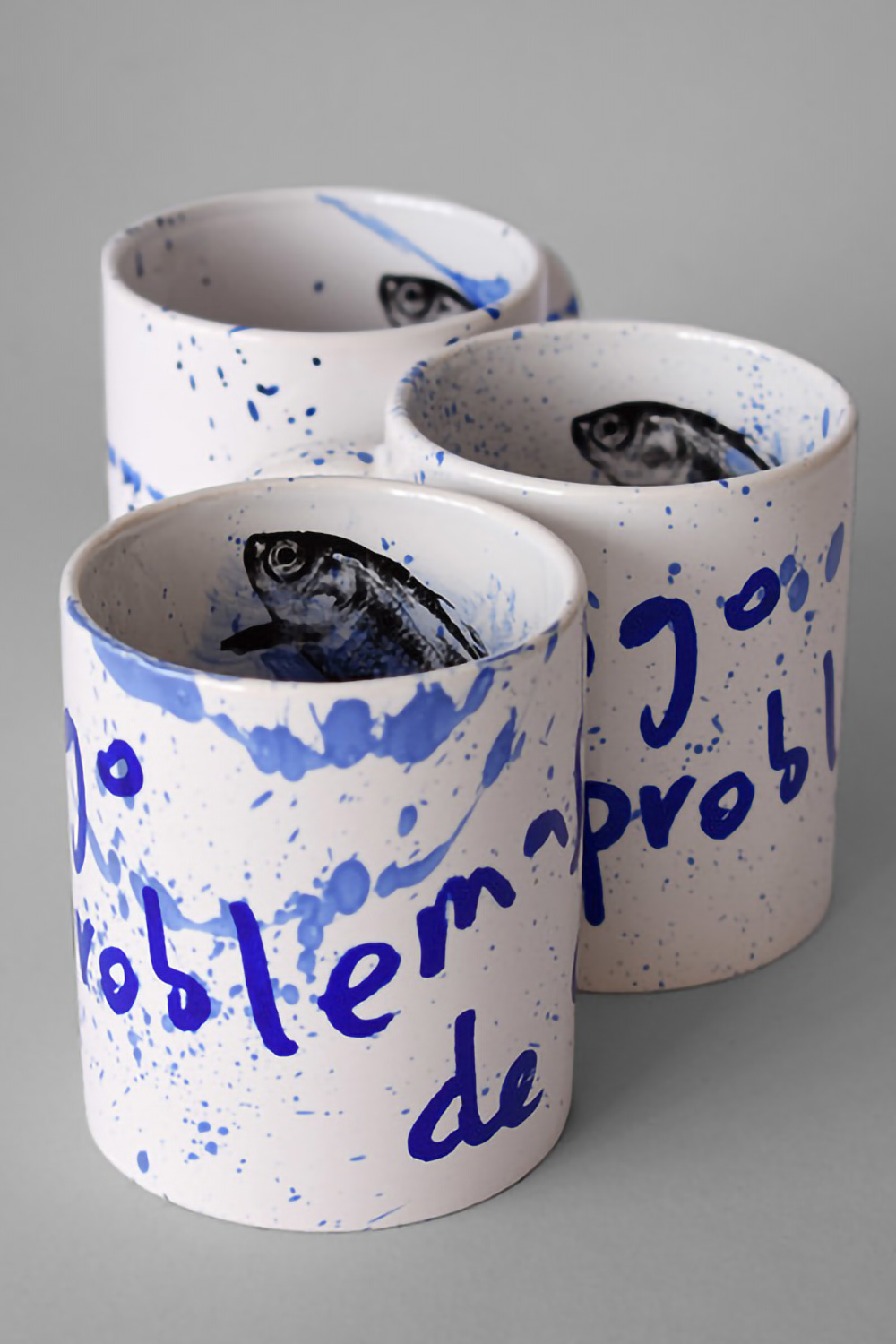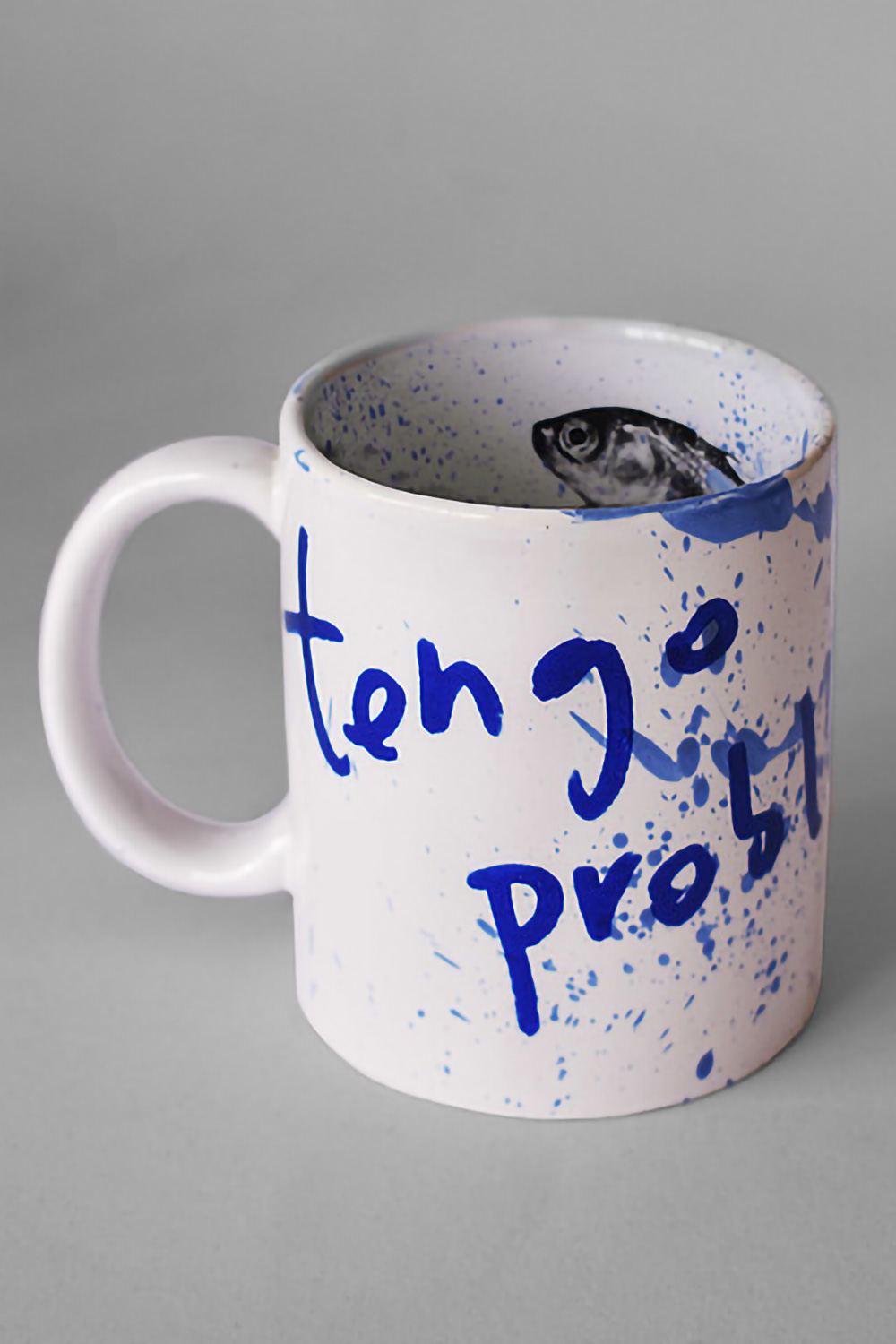 La tinta azul, además de en la serigrafía de la frase, la hemos aplicado a brochazos y salpicones, lo que hace que cada taza sea única.